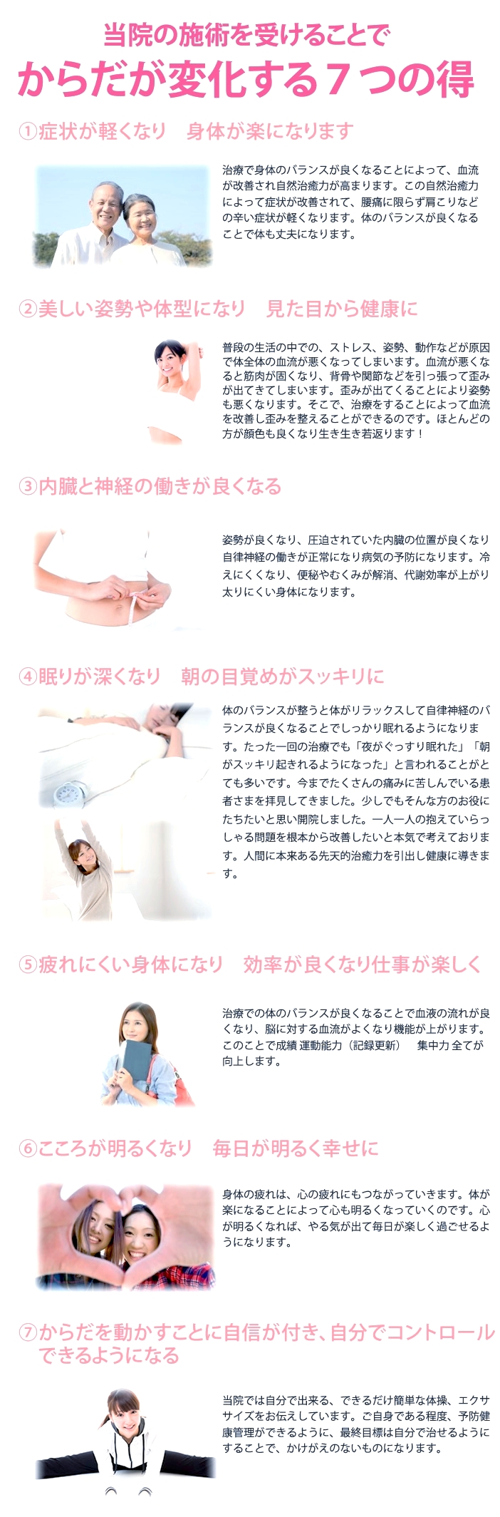 お悩みの症状が改善に向かうことはあっても、悪化することございません。どうぞ安心して、大きな期待と希望を持ってご来院ください。