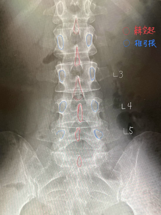 L5の棘突起は左に偏位しているように見えますが、これは「ずれ」ではなく、棘突起の個体差によるものです。なお、椎弓根の並びは正常です